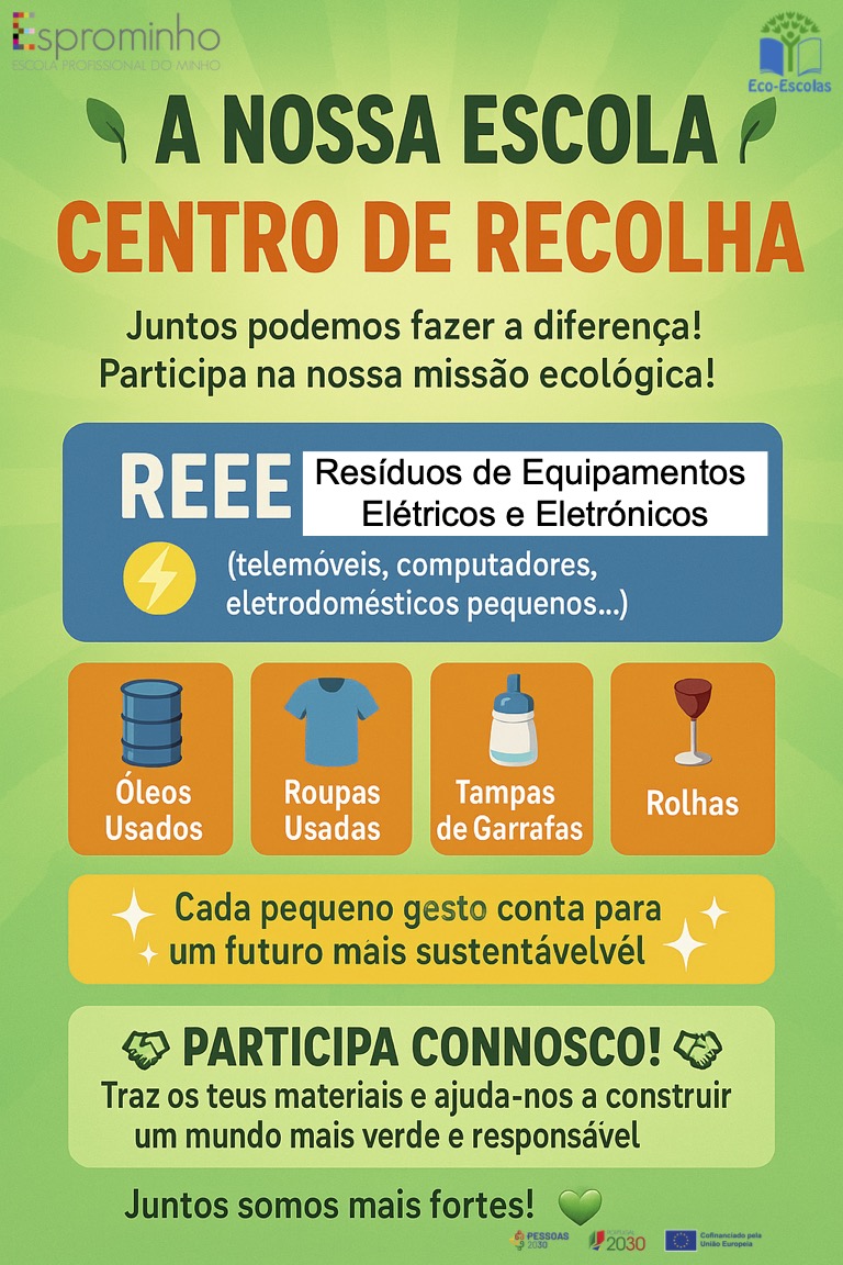 Na EsproMinho, o Eco-Escolas vai muito além da teoria. Envolvemos alunos e professores em atividades práticas que promovem o cuidado com o ambiente e inspiram atitudes responsáveis no dia a dia. Reciclagem, redução de resíduos, uso eficiente da água e energia, proteção da biodiversidade — são alguns dos temas que trabalhamos, sempre com o objetivo de construir uma comunidade escolar mais consciente e sustentável.